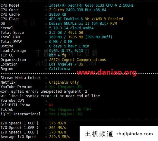 验明正身,CPU是至强金牌6133,主频2.50GHz。磁盘I/O平均速度跑到了349.3 MB/s,对于U.2固态来说是个不错的成绩,日常建站、跑应用都绰绰有余。