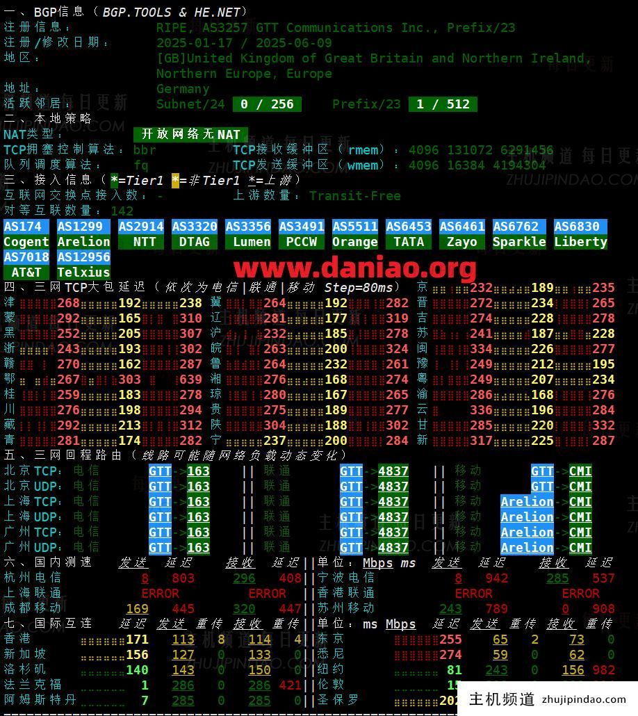 北京电信 NextTrace v1.4.0 2025-04-16T01:10:07Z dccc41b [NextTrace API] preferred API IP - 45.137.198.56 - 73.72ms - 🐠 (Relay) → Misaka.BER IP Geo Data Provider: LeoMoeAPI traceroute to 219.141.147.210, 30 hops max, 52 bytes payload, ICMP mode 1 45.152.20.1 AS3257 德国 黑森州 美因河畔法兰克福 gtt.net 1.52 ms / 1.25 ms / 1.07 ms 2 213.39.48.117 AS3257 德国 黑森 美因河畔法兰克福 gtt.net et-0-0-26-0.cr11-fra2.ip4.gtt.net 2.14 ms / 52.67 ms / * ms 3 213.200.117.178 AS3257 [GTT-EU] 荷兰 北荷兰省 阿姆斯特丹 gtt.net ae11.cr6-ams1.ip4.gtt.net 7.81 ms / 7.18 ms / 7.42 ms 4 81.173.18.1 AS4134 荷兰 北荷兰省 阿姆斯特丹 www.chinatelecom.com.cn 7.34 ms / 7.30 ms / 7.34 ms 5 202.97.40.101 AS4134 [CHINANET-BB] 中国 北京 www.chinatelecom.com.cn 电信 218.22 ms / 218.06 ms / 218.14 ms 6 202.97.12.53 AS4134 [CHINANET-BB] 中国 北京 www.chinatelecom.com.cn 电信 220.20 ms / 220.21 ms / 220.16 ms 7 * 8 * 9 * 10 106.120.254.6 AS4847 [CHINANET-GD] 中国 北京 chinatelecom.cn 222.52 ms / 222.71 ms / 223.12 ms 11 219.141.147.210 AS4847 [CHINATELECOM-BJ] 中国 北京 chinatelecom.cn 222.68 ms / 222.72 ms / 222.73 ms ---------------------------------------------------------------------- 上海电信 NextTrace v1.4.0 2025-04-16T01:10:07Z dccc41b [NextTrace API] preferred API IP - 45.137.198.56 - 71.29ms - 🐠 (Relay) → Misaka.BER IP Geo Data Provider: LeoMoeAPI traceroute to 202.96.209.133, 30 hops max, 52 bytes payload, ICMP mode 1 45.152.20.1 AS3257 德国 黑森州 美因河畔法兰克福 gtt.net 1.23 ms / 1.23 ms / 1.22 ms 2 213.39.48.117 AS3257 德国 黑森 美因河畔法兰克福 gtt.net et-0-0-26-0.cr11-fra2.ip4.gtt.net 103.10 ms / * ms / * ms 3 213.200.117.178 AS3257 [GTT-EU] 荷兰 北荷兰省 阿姆斯特丹 gtt.net ae11.cr6-ams1.ip4.gtt.net 29.40 ms / 54.87 ms / 7.53 ms 4 81.173.18.1 AS4134 荷兰 北荷兰省 阿姆斯特丹 www.chinatelecom.com.cn 7.51 ms / 7.32 ms / 7.47 ms 5 * 6 * 7 * 8 61.152.26.85 AS4812 [CHINANET-SH] 中国 上海 chinatelecom.cn 电信 228.54 ms / 225.99 ms / 223.38 ms 9 61.152.1.166 AS4812 [CHINANET-SH] 中国 上海 chinatelecom.cn 257.86 ms / 220.45 ms / 215.40 ms 10 202.96.209.133 AS4812 [CHINANET-SH] 中国 上海 chinatelecom.cn 电信 221.65 ms / 221.54 ms / 221.58 ms ---------------------------------------------------------------------- 深圳电信 NextTrace v1.4.0 2025-04-16T01:10:07Z dccc41b [NextTrace API] preferred API IP - 45.137.198.56 - 70.12ms - 🐠 (Relay) → Misaka.BER IP Geo Data Provider: LeoMoeAPI traceroute to 58.60.188.222, 30 hops max, 52 bytes payload, ICMP mode 1 45.152.20.1 AS3257 德国 黑森州 美因河畔法兰克福 gtt.net 1.39 ms / 1.30 ms / 1.30 ms 2 213.39.48.117 AS3257 德国 黑森 美因河畔法兰克福 gtt.net et-0-0-26-0.cr11-fra2.ip4.gtt.net 4.18 ms / 9.43 ms / * ms 3 213.200.117.178 AS3257 [GTT-EU] 荷兰 北荷兰省 阿姆斯特丹 gtt.net ae11.cr6-ams1.ip4.gtt.net 7.04 ms / 7.21 ms / 77.73 ms 4 81.173.18.1 AS4134 荷兰 北荷兰省 阿姆斯特丹 www.chinatelecom.com.cn 7.31 ms / 7.47 ms / 7.20 ms 5 202.97.13.25 AS4134 [CHINANET-BB] 中国 广东 广州 欧洲回国方向 www.chinatelecom.com.cn 电信 253.22 ms / 253.08 ms / 259.82 ms 6 202.97.65.70 AS4134 [CHINANET-BB] 中国 广东 广州 www.chinatelecom.com.cn 256.47 ms / * ms / * ms 7 * 8 14.147.127.14 AS134774 [CHINANET-GD] 中国 广东 深圳 chinatelecom.cn 电信 * ms / * ms / 358.84 ms 9 * 10 58.60.188.222 AS4134 中国 广东 深圳 福田区 www.chinatelecom.com.cn 电信 263.82 ms / 263.75 ms / 263.74 ms