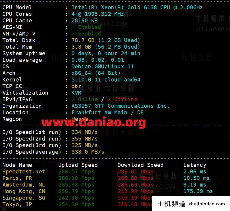 拿到手,先跑个脚本看看机器的基本信息。CPU是Intel金牌6138,主频2.00GHz,不算高,但对于这类用途也够了。磁盘IO随手一测在338 MB/s左右,嗯,是NVMe该有的样子。