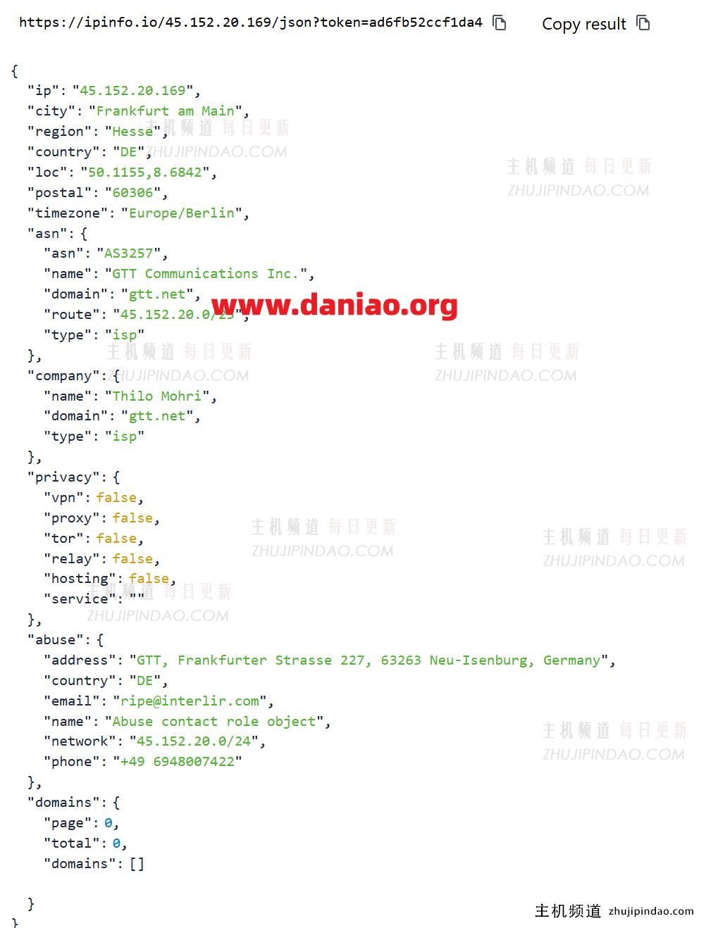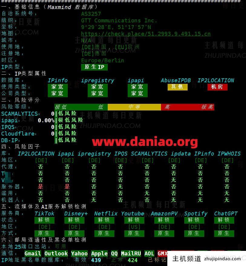 重头戏来了,IP质量到底怎么样?从ipinfo的报告看,确实是双ISP属性,运营商是GTT。这个“双ISP”标识就是原生IP的重要特征,很多平台就认这个,能有效避免被当成机房IP而区别对待。
