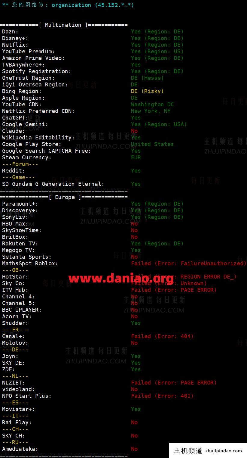 再看看流媒体解锁能力,这部分可以说是相当强悍了。从测试结果来看,德国区的Netflix、Disney+、Amazon Prime Video等主流平台基本全绿,完美解锁。这对有流媒体观看需求的朋友来说,绝对是个好消息。