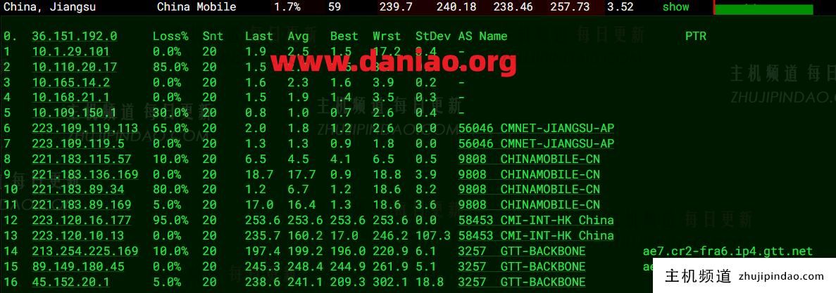 ---------------------------------------------------------------------- 北京移动 NextTrace v1.4.0 2025-04-16T01:10:07Z dccc41b [NextTrace API] preferred API IP - 45.137.198.56 - 67.98ms - 🐠 (Relay) → Misaka.BER IP Geo Data Provider: LeoMoeAPI traceroute to 221.179.155.161, 30 hops max, 52 bytes payload, ICMP mode 1 45.152.20.1 AS3257 德国 黑森州 美因河畔法兰克福 gtt.net 1.35 ms / 1.28 ms / 1.25 ms 2 213.39.48.117 AS3257 德国 黑森 美因河畔法兰克福 gtt.net et-0-0-26-0.cr11-fra2.ip4.gtt.net 1.47 ms / * ms / * ms 3 89.149.128.174 * [GTT-BACKBONE] 美国 加利福尼亚 洛杉矶 136.47 ms / 136.28 ms / 135.70 ms 4 198.47.106.150 AS3257 美国 弗吉尼亚州 麦克莱恩 gtt.net 135.91 ms / 136.01 ms / 135.89 ms 5 223.120.6.217 AS58453 [CMI-INT] 美国 加利福尼亚 洛杉矶 cmi.chinamobile.com 移动 135.89 ms / 135.95 ms / 136.01 ms 6 223.120.12.214 AS58453 [CMI-INT] 中国 上海 CMI-CM-Peer cmi.chinamobile.com 移动 221.44 ms / 224.61 ms / 221.92 ms 7 221.183.55.106 AS9808 [CMNET] 中国 北京 X-I chinamobileltd.com 移动 229.98 ms / 229.96 ms / 229.91 ms 8 221.183.46.250 AS9808 [CMNET] 中国 北京 I-C chinamobileltd.com 移动 289.91 ms / 289.75 ms / 289.76 ms 9 * 10 221.183.46.178 AS9808 [CMNET] 中国 北京 chinamobileltd.com 移动 274.05 ms / 274.00 ms / * ms 11 * 12 221.179.155.161 AS56048 [CMNET] 中国 北京 bj.10086.cn 移动 232.73 ms / 232.72 ms / 232.66 ms ---------------------------------------------------------------------- 上海移动 NextTrace v1.4.0 2025-04-16T01:10:07Z dccc41b [NextTrace API] preferred API IP - 45.137.198.56 - 68.52ms - 🐠 (Relay) → Misaka.BER IP Geo Data Provider: LeoMoeAPI traceroute to 211.136.112.200, 30 hops max, 52 bytes payload, ICMP mode 1 45.152.20.1 AS3257 德国 黑森州 美因河畔法兰克福 gtt.net 1.18 ms / 1.27 ms / 1.43 ms 2 213.39.48.117 AS3257 德国 黑森 美因河畔法兰克福 gtt.net et-0-0-26-0.cr11-fra2.ip4.gtt.net 102.90 ms / * ms / * ms 3 213.200.116.225 AS3257 [GTT-EU] 德国 黑森 美因河畔法兰克福 gtt.net ae21.cr2-fra6.ip4.gtt.net 18.37 ms / 1.85 ms / 1.71 ms 4 213.254.225.170 AS3257 [GTT-EU] 德国 黑森 美因河畔法兰克福 gtt.net 4.82 ms / 3.37 ms / 2.97 ms 5 223.120.10.41 AS58453 [CMI-INT] 德国 黑森 美茵河畔法兰克福 cmi.chinamobile.com 移动 2.53 ms / 2.78 ms / 4.01 ms 6 223.120.11.70 AS58453 [CMI-INT] 中国 上海 cmi.chinamobile.com 191.48 ms / 197.70 ms / 191.65 ms 7 221.183.89.174 AS9808 [CMNET] 中国 上海 X-I chinamobileltd.com 移动 190.56 ms / 190.06 ms / * ms 8 * 9 221.183.89.50 AS9808 [CMNET] 中国 上海 chinamobileltd.com 移动 193.86 ms / 244.99 ms / * ms 10 * 11 * 12 211.136.112.252 AS24400 [CMNET] 中国 上海 sh.10086.cn 移动 193.53 ms / 193.57 ms / 193.61 ms 13 211.136.112.200 AS24400 [CMNET] 中国 上海 浦东新区 sh.10086.cn 移动 197.31 ms / 197.09 ms / 197.11 ms ---------------------------------------------------------------------- 深圳移动 NextTrace v1.4.0 2025-04-16T01:10:07Z dccc41b [NextTrace API] preferred API IP - 45.137.198.56 - 72.04ms - 🐠 (Relay) → Misaka.BER IP Geo Data Provider: LeoMoeAPI traceroute to 120.196.165.24, 30 hops max, 52 bytes payload, ICMP mode 1 45.152.20.1 AS3257 德国 黑森州 美因河畔法兰克福 gtt.net 1.35 ms / 1.40 ms / 1.54 ms 2 213.39.48.117 AS3257 德国 黑森 美因河畔法兰克福 gtt.net et-0-0-26-0.cr11-fra2.ip4.gtt.net 57.83 ms / 51.96 ms / * ms 3 213.200.116.225 AS3257 [GTT-EU] 德国 黑森 美因河畔法兰克福 gtt.net ae21.cr2-fra6.ip4.gtt.net 1.95 ms / 2.21 ms / 1.94 ms 4 213.254.225.170 AS3257 [GTT-EU] 德国 黑森 美因河畔法兰克福 gtt.net ip4.gtt.net 2.87 ms / 2.75 ms / 3.10 ms 5 223.120.10.85 AS58453 [CMI-INT] 德国 黑森 美茵河畔法兰克福 cmi.chinamobile.com 移动 8.20 ms / 2.65 ms / 2.21 ms 6 223.120.15.226 AS58453 [CMI-INT] 德国 黑森 美因河畔法兰克福 cmi.chinamobile.com 移动 215.49 ms / 228.16 ms / 220.64 ms 7 221.183.55.82 AS9808 [CMNET] 中国 广东 广州 chinamobileltd.com 移动 220.59 ms / 209.26 ms / * ms 8 221.183.92.17 AS9808 [CMNET] 中国 广东 广州 I-C chinamobileltd.com 移动 210.35 ms / 210.04 ms / 210.09 ms 9 221.183.89.242 AS9808 [CMNET] 中国 广东 广州 chinamobileltd.com 移动 210.68 ms / * ms / * ms 10 221.183.71.78 AS9808 [CMNET] 中国 广东 广州 chinamobileltd.com 移动 212.48 ms / 212.43 ms / 212.45 ms 11 221.183.110.166 AS9808 [CMNET] 中国 广东 广州 chinamobileltd.com 移动 214.89 ms / 214.83 ms / * ms 12 120.196.165.24 AS56040 [APNIC-AP] 中国 广东 深圳 gd.10086.cn 移动 215.72 ms / 215.76 ms / 215.71 ms