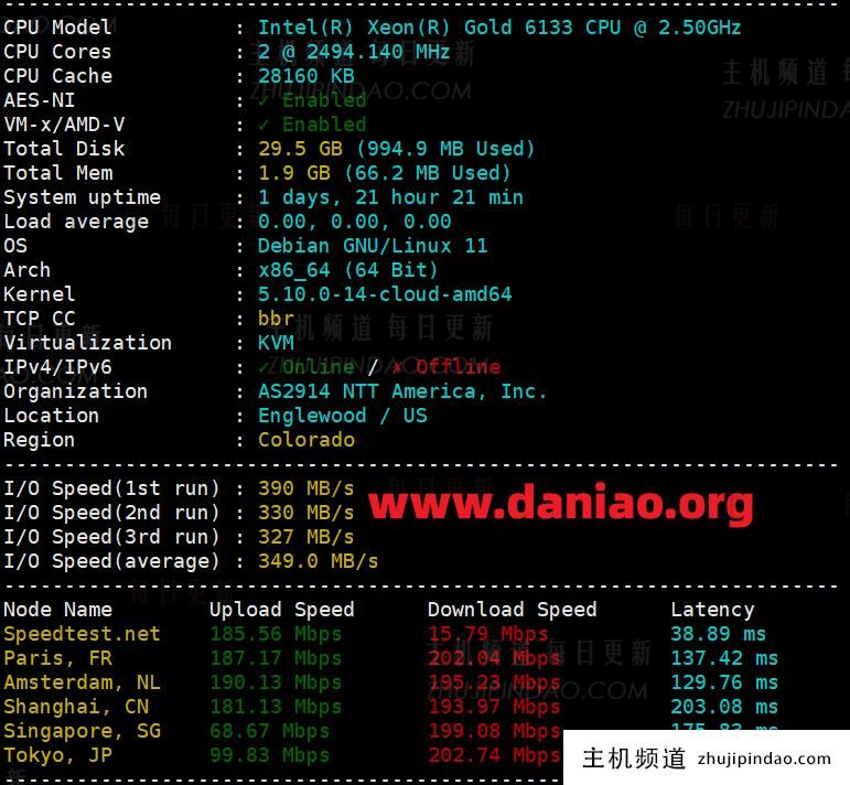拿到手先跑个基础信息看看。CPU用的是Xeon Gold 6133,主频2.50GHz,性能还可以。磁盘I/O随便跑了一下,在350MB/s左右,对于SSD来说是个中规中矩的水平,日常使用绝对够了。