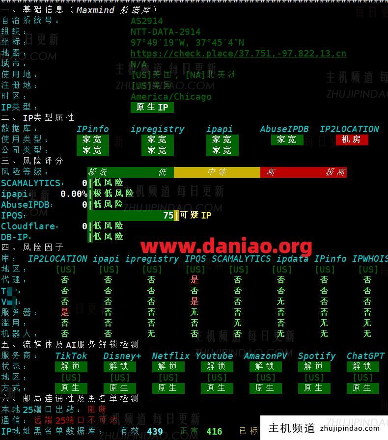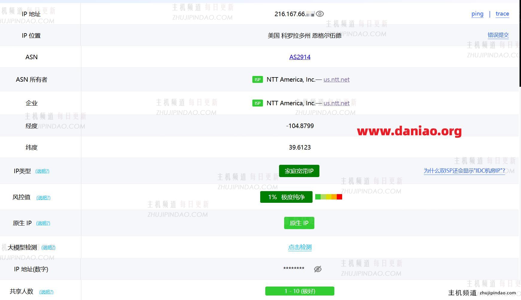再看看IP的纯净度,欺诈分(Scamalytics)是0分,说明IP非常干净。